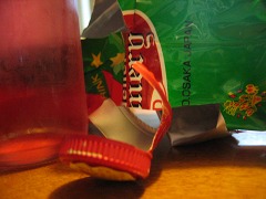 冷蔵庫を開けたら丁度いい具合に、赤のシャンメリーが冷えている。